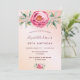 Um convite romântico para uma festa de aniversário 50ª (ou qualquer idade). Um fundo rosa dourado e cinza rosa-claro. Rosa cor-de-rosa grande, folhas verdes, folhagem com flores ouros pequenas. Uma fita-gota-gota-relva rosa dourada por trás das flores. Personalize e adicione um nome e detalhes da parte. Letras rosa escuras de cor dourada. O nome é escrito com um moderno estilo escrito à mão. Traseira: Rosa dourado, fundo cor-de-rosa pincelado.