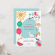 Um convite de aniversário de criança com um flamingo, carro-frade Unicórnio, Balão, Sol, Piscina, picolés.