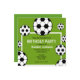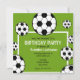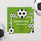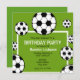 Um convite de festa de aniversário com um fundo verde e bolas de futebol ao redor de texto preto e branco.