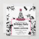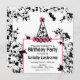 Um convite de aniversário com uma ilustração de uma festa com pinturas pretas e aparas cor-de-rosa e pretas no topo. Personalize o texto abaixo. A tela de fundo é a tinta preta.
