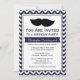 Um bigode e um convite de aniversário com padrão de chevron em azul marinho, preto e branco para hipsteres que enxergam o coração!