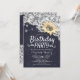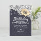 Convite de aniversário - Girassóis Elegantes, Vintage Lace Frame e Chic String Lights no Marinho Blue Background. Um Design perfeito para o seu grande dia. Todo estilo de texto, cores, tamanhos podem ser modificados para ajustado das suas necessidades!