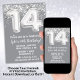convite de aniversário e 14 prateado 14 cinza para um menino ou menina com roteiro moderno escrevendo e balões de folha divertida.