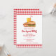 Ilustração de fast food da Destei com um cachorro-quente que tem ketchup e mostarda em cima, uma bebida laranja com um canudo vermelho e um pão de hambúrguer de sementes de sésamo recheado com carne, alface, tomate, ketchup, picles e queijo. A parte superior e inferior apresentam um padrão xadrez vermelho, enquanto a maior parte da cor do fundo é branca. O padrão xadrez vermelho também é colocado do outro lado do cartão. Personalize o texto com os detalhes do seu evento, seja uma festa de aniversário, piquenique ou churrasco de verão, por exemplo.