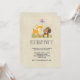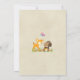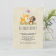 Um convite de festa de aniversário com uma ilustração fofa apresentando um cervo bebê e um esquilo pequeno segurando uma bolota e uma borboleta voando acima de suas cabeças. Esses adoráveis animais da floresta estão em pé sobre algumas folhas com alguns cogumelos caprichosos aos seus pés.