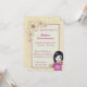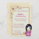 Uma menina de gueixa nova bonito em um design estilizado da arte do chibi. Tem o cabelo preto escuro vestido para baixo, os olhos brilhantes grandes do fuscia com acentos vermelhos, o escarlate brilhante dos lábios lustrosos vermelhos, e os fãs do ouro branco em suas mãos. Seu quimono é rosa colorido com teste padrão branco da flor de cerejeira e sua bruxaria africana é uma cor roxa com teste padrão japonês de prata do dragão. Olha delicada e elegante com uma expressão misteriosa. Um teste padrão da flor de cerejeira com acentos cor-de-rosa e roxos em um fundo claro macia colorido do amarelo do creme. Uns trabalhos de arte digitais originais. O design é bonito e elegante feito especialmente para um convite personalizado à festa de aniversário de uma menina, à revelia uma 13a festa de aniversário mas pode ser personalizado a toda a idade. O texto customizável inclui o nome, a data, o tempo, o endereço, e a informação do rsvp.