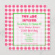 Um convite de aniversário com um esquema de cores cor-de-rosa e verde brilhante. O fundo é bolinhas cor-de-rosa na parte dianteira e na parte traseira. Personalize o texto com detalhes de sua ocasião. O papel é metálico, mas pode ser mudado antes da compra.