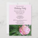 Este convite de aniversário apresenta um fundo cor-de-rosa pastel e uma foto de uma flor de pénia rosa. Comprar este convite para as suas necessidades de festa de aniversário. A modelo é para uma avó, mas você pode editá-la adicionando suas informações.