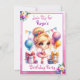 Convites de festas de aniversários de garotinha fofa. Ilustração de aquarela doce de uma bailarina loira num tutu rosa e roxo com sotaques florais bonito.