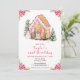Este convite de aniversário elegante e festivo apresenta uma casa de pão de gengibre de aquarela e lindas flores de poinsettia rosa. O texto combina o script manuscrito e as fontes sans serif para uma aparência na moda e moderna. O boneco de neve, pinheiro decorado e coroa de férias adicionam um toque festivo. Isto é perfeito para festas de aniversário de Natal.