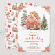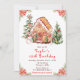 Este convite de aniversário elegante e festivo apresenta uma casa de pão de gengibre de aquarela e lindas flores vermelhas de poinsettia. O texto combina o script manuscrito e as fontes sans serif para uma aparência na moda e moderna. O boneco de neve, pinheiro decorado e coroa de férias adicionam um toque festivo. Isto é perfeito para festas de aniversário de Natal.