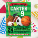 Perfeito para a festa de aniversário desportiva do seu filho. Apresentando, baseball, futebol, futebol, tênis, bola de cesto e assobio de árbitro, este convite pode ser usado para qualquer idade. Impressão de retorno incluído, adicione texto adicional à parte traseira, se necessário.