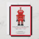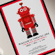 Celebre o seu primeiro aniversário com o nosso moderno Convite de aniversário de robôs vermelhos. Designs apresentam um brinquedo robô vermelho com sobre cinzas, fundo preto e branco, cor de fundo é editável. Cartões inverter para o padrão de faixas pretas editável. Põe-te a andar e vai a loucos com este convite de festas de fábrica de robôs. Este Crank up as suas engrenagens, os convites de aniversário de robôs são perfeitos para o tema de primeira festa de aniversário de robôs divertidos do seu robô.