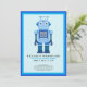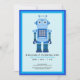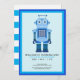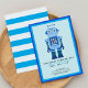 Celebre o seu primeiro aniversário com o nosso moderno Convite de aniversário de robôs azuis. Designs apresentam um brinquedo robô azul sobre fundo azul claro e azul claro, a cor de fundo é editável. Cartões inverter para o padrão de faixas azuis editável. Põe-te a andar e vai a loucos com este convite de festas de fábrica de robôs. Este Crank up your gear robot, convites de aniversário é perfeito para a sua primeira festa de aniversário de robô, divertida festa de robô, para os convites de aniversário de transformadores, festa de robô retrô.