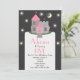 convite de aniversário para uma menina com ilustração de um castelo de princesa rosa e cinza cercado pela lua e estrelas sobre um fundo escuro de cinza. Personalize com detalhes da sua ocasião.