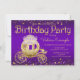 Convite de festa de aniversário da princesa roxa e dourada com carruagem real da princesa roxa e dourada em um lindo fundo de confetes roxos e dourados. Você pode personalizar facilmente este convite de festa de aniversário para meninas roxas e douradas para o seu evento, simplesmente adicionando seus detalhes no estilo de fonte que preferir. Este é um design impresso sem diamantes reais, folha, brilho, etc.