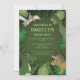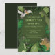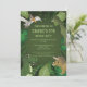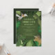 A ilustração fofa original de Destei de diferentes dinossauros pré-históricos juntamente com uma folhagem de plantas da selva verde. Os dinossauros incluídos são Tyrannosaurus / T-rex, Tricerátops, Pteranodon e Brachiosaurus. Os dinossauros e plantas são colocados nas bordas moldando o texto verde-claro no meio. A cor de fundo é verde. Do outro lado há mais plantas em um canto enquanto o restante da cor de fundo é verde-escuro. Personalize as áreas de texto de exemplo com os detalhes do seu evento.