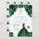 Este elegante e glamouroso convite de aniversário apresenta uma bela princesa com cabelo morena em um vestido verde-escuro de bola. O texto combina o script manuscrito e as fontes sans serif modernas para um aspecto elegante e sofisticado. Os arranjos florais, borboleta e confete prateado criam a mistura perfeita de rústico e chic. Gráficos por www.etsy.com/uk/shop/SunflowerDayLove