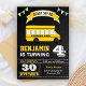 Surpreenda seus convidados com este convite de festa de aniversário temático de ônibus escolar, apresentando um lindo ônibus escolar amarelo com tipografia moderna contra um fundo de lousa. Basta adicionar os detalhes do evento neste modelo fácil de usar para torná-lo um convite único. Vire o cartão para revelar um padrão vibrante de listras amarelas e pretas no verso do cartão.