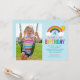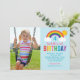 Este convite de aniversário colorido com tema de arco-íris apresenta um layout horizontal com a foto da criança ao lado de um arco-íris brilhante, sol dourado e nuvens fofas em um fundo azul claro. A letra "Aniversário" em negrito e colorida como um arco-íris faz uma declaração divertida e chamativa, com o nome e a idade da criança exibidos em uma fonte cursiva rosa e turquesa. Os detalhes da festa são impressos em tipografia colorida coordenada abaixo. Todo o texto é totalmente personalizável, incluindo o nome, idade e informações do evento.