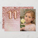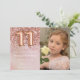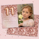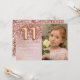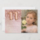 Convite de aniversário rosa de 11 de ouro fotográfico para uma menina de 11 anos com roteiro elegante escrevendo e balões de folha de papel divertida.