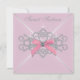 Convite de festa de aniversário de 16 anos rosa com laço rosa e diamantes brancos.
