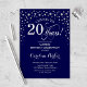 Convite de aniversário de 20 surpresa. Design elegante em azul marinho e prata brilhante fraca. Apresenta a fonte do script e os diamantes confetti. Alegra-me a 20 anos! Envie-me uma mensagem se precisar de mais personalização.
