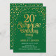 Convite de aniversário de 20 surpresa. Design elegante na floresta verde e ouro brilhante. Possui fonte de script na moda e confetti. Envie-me uma mensagem se precisar de idade personalizada.