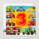 Nove caminhões coloridos cercam um excelente grande número 3! Em um fazer de fundo azul e amarelo um convite ou anúncio muito colorido e divertido. Perfeito para o caminhão de bombeiros, escavador, caminhão ou trator louco com 3 anos na aniversário de 3 anos. Maravilhoso pela sua Festa de aniversário de Truck Themed de 3 anos. As crianças adoram caminhões de bombeiros, caminhões, diggers e tratores. Obras modernas de construção e festas de aniversário para veículos pesados, acessórios, favoritos para festas e presentes. Todos os designs e ilustrações de caminhão © Paul Stickland