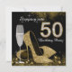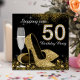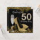 Convite de festa de aniversário de 50 anos black and gold com taça de champanhe elegante e sapatos de salto alto dourados. Você pode personalizar facilmente este convite de festa de aniversário de 50 anos black and gold para o seu evento, simplesmente adicionando seus detalhes no estilo de fonte e cor, e na redação de sua escolha. Você também pode alterar a cor do fundo.