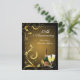 Convite de aniversário personalizado elegante para 50 anos ou qualquer ano. Convites bonitos e festivos apresentam design preto e dourado com padrão de redemoinho elegante e duas taças de champanhe espumante com garrafa de champanhe com tonalidade verde para celebrar o grande dia dos convidados de honra.