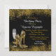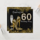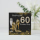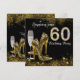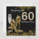 Convite de festa de aniversário de 60 anos preto e dourado com taça de champanhe elegante e sapatos de salto alto onça dourados. Você pode personalizar facilmente este convite de festa de aniversário de 60 anos preto e dourado para o seu evento, simplesmente adicionando seus detalhes no estilo de fonte e cor, e na redação de sua escolha. Você também pode alterar a cor do fundo.