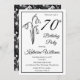 Neve elegante, mês de nascimento, design de "Festa de aniversário 70" floral design com um motif floral de queda de neve com um padrão floral de queda de neve preto e branco atrás.