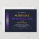 Um convite de aniversário de 70 de surpresa azul moderno que apresenta índigo vibrante a faixas roxas no lado esquerdo do convite e a palavra SURPRISE em ouro. Um convite perfeitamente personalizável, disponível em vários tipos de papel, desde a roupa até à prata metálica. As opções de impressão padrão são padrão, mas podem ser impressas em alta definição para vibração adicional às cores.