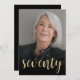A frente deste convite de 70 de aniversário apresenta a foto do convidado de honra com uma camada de texto dourada. A palavra "setenta" aparece num elegante roteiro de caligrafia dourada. Uma tela escura ajuda a tornar o texto pop. Personalize o lado inverso com o nome e os detalhes da parte em um plano de fundo preto. Uma forma excelente de celebrar alguém que faz setenta anos!