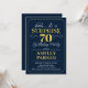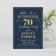 Convite de aniversário de 70 surpresa. Design simples em marinho azul e amarelo. Apresenta uma fonte elegante de script. Celebração surpresa para homem ou mulher. Pode ser personalizado em qualquer idade!
