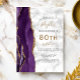 A borda esquerda deste elegante convite de aniversário moderno apresenta uma cor d'água roxa, borda agitada com brilho dourado. O texto personalizável combina manuscrito preto e dourado, fontes em copperplate e itálico em uma cinza e fundo de textura de mármore branco. O verso apresenta um design de agate roxo e dourado correspondente.