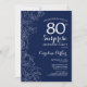 Convite de aniversário 80 azul-marinho e branco-surpresa. Design minimalista moderno com sotaques botânicos e letra de escrita tipográfica. Simples cartão de convite floral perfeito para uma festa surpresa na moda. Pode ser personalizado para qualquer idade. Impressos convites Zazzle ou modelo de impressão digital instantânea para download.