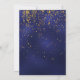 Um cartão de convite de aniversário festivo e elegante. Uma cor de fundo azul-da-meia-noite escura e uma imagem de ouro falsa. Com um ouro de chuva confete. Modelos para informações sobre a sua festa, cartas de ouro. A cor azul é irregular. Volta: pano de fundo azul e chuva confete.