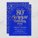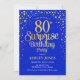 Convite de aniversário de 80 surpresa. Design elegante em azul real e ouro brilhante falso. Possui fonte de script na moda e confetti. Envie-me uma mensagem se precisar de idade personalizada.