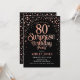Convite de aniversário de 80 surpresa. Design elegante em preto e brilhante rosa de ouro. Possui fonte de script na moda e confetti. Envie-me uma mensagem se precisar de idade personalizada.