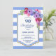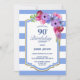 Convite para festa de aniversário de 90 anos com listras azuis florais.