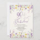 Um convite de aniversário elegante de 90 de creme claro com "90 & Fabuloso" apresentado num guião púrpura cúbico e aquarelas de flores silvestres roxas, rosa e amarelas. Personalize o nome da honraria e os detalhes do partido em simples inscrições modernas.