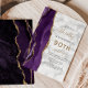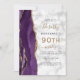 A borda esquerda deste elegante convite de aniversário moderno apresenta uma cor d'água roxa, borda agitada com brilho dourado. O texto personalizável combina manuscrito preto e dourado, fontes em copperplate e itálico em uma cinza e fundo de textura de mármore branco. O verso apresenta um design de agate roxo e dourado correspondente.