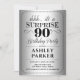Convite de aniversário de 90 surpresa. Design simples em prata e preto. Apresentando padrão de folha de prata falsa e fonte elegante de script. Celebração surpresa para homem ou mulher. Pode ser personalizado em qualquer idade!