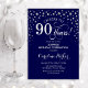 Convite de aniversário de 90 surpresa. Design elegante em azul marinho e prata brilhante fraca. Apresenta a fonte do script e os diamantes confetti. Saúde para 90 anos! Envie-me uma mensagem se precisar de mais personalização.