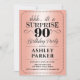 Convite de aniversário de 90 surpresa. Design simples em ouro rosa e preto. Apresentando um padrão de folha de rosa dourado falso e uma letra de script elegante. Celebração surpresa para homem ou mulher. Pode ser personalizado em qualquer idade!