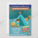 Um lindo cabeleireiro marrom a brindar marshmallows num acampamento ao lado de uma tenda azul com uma bandeira laranja. À distância estão as árvores e o céu azul escuro e as estrelas. Gráficos por Prettygrafik Design