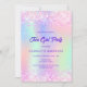 Um convite de aniversário feminino e feminino para uma menina adolescente. Na frente: Um arco-íris, fundo holográfico colorido em roxo, rosa, verde-menta. Decorado com faíscas rosadas. Personalize e adicione um nome e detalhes da parte. O nome é escrito com um script de estilo manuscrito, letras cor roxa.