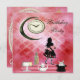 A Bonito festa de aniversário Alice no País das Maravilhas convida garotas e mulheres de todas as idades - Whimsical, fofinho e bonito, Alice surreal nos convites de Wonderland com uma bonito silhueta preta de Alice carregando um flamingo rosa elegante. Ela está parada no topo de uma escada rosa perto de um ornamento lua de lua de ouro com um relógio pendurado nela. Escrito no relógio está escrito "Estou atrasado Estou atrasado para um encontro muito importante" Também na escada está um bonito bule branco, um bolo em uma barraca, uma garrafa de bebida bonita para mim e um coelho branco em um chapéu preto de chapéu de chapéu. Ao contrário dos convites há um lindo e branco colar e um tapete de pérolas com rosas cor-de-rosa para você personalizar com seus detalhes do evento, o arauto do coelho branco, rainha de corações tocando cartas, relógio de bolso de ouro e um coração de tarte de geleia. Na moda, moderno, chico, glamouroso convites de arte de fantasia. Se você precisar de assistência personalizando seu produto, entre em minha loja e eu vou ficar feliz ajuda. Pérolas e tapetes de renda no verso de convites ©Hazel Kinvig-Paul www.design-a-dream.co.uk Por favor, note: Todos os convites no Zazzle têm imagens impressas em formato plano.